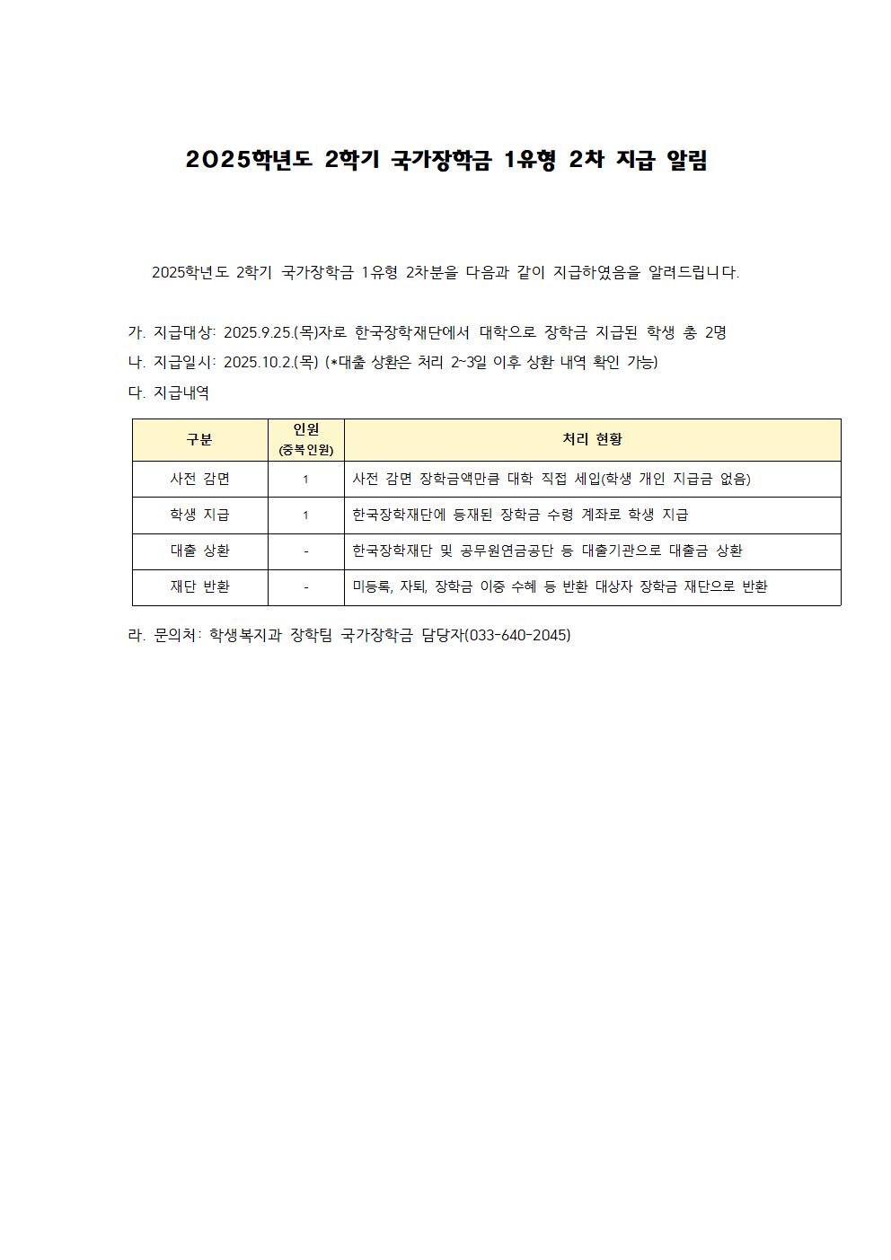 2025학년도 2학기 국가장학금 1유형 2차 지급 알림