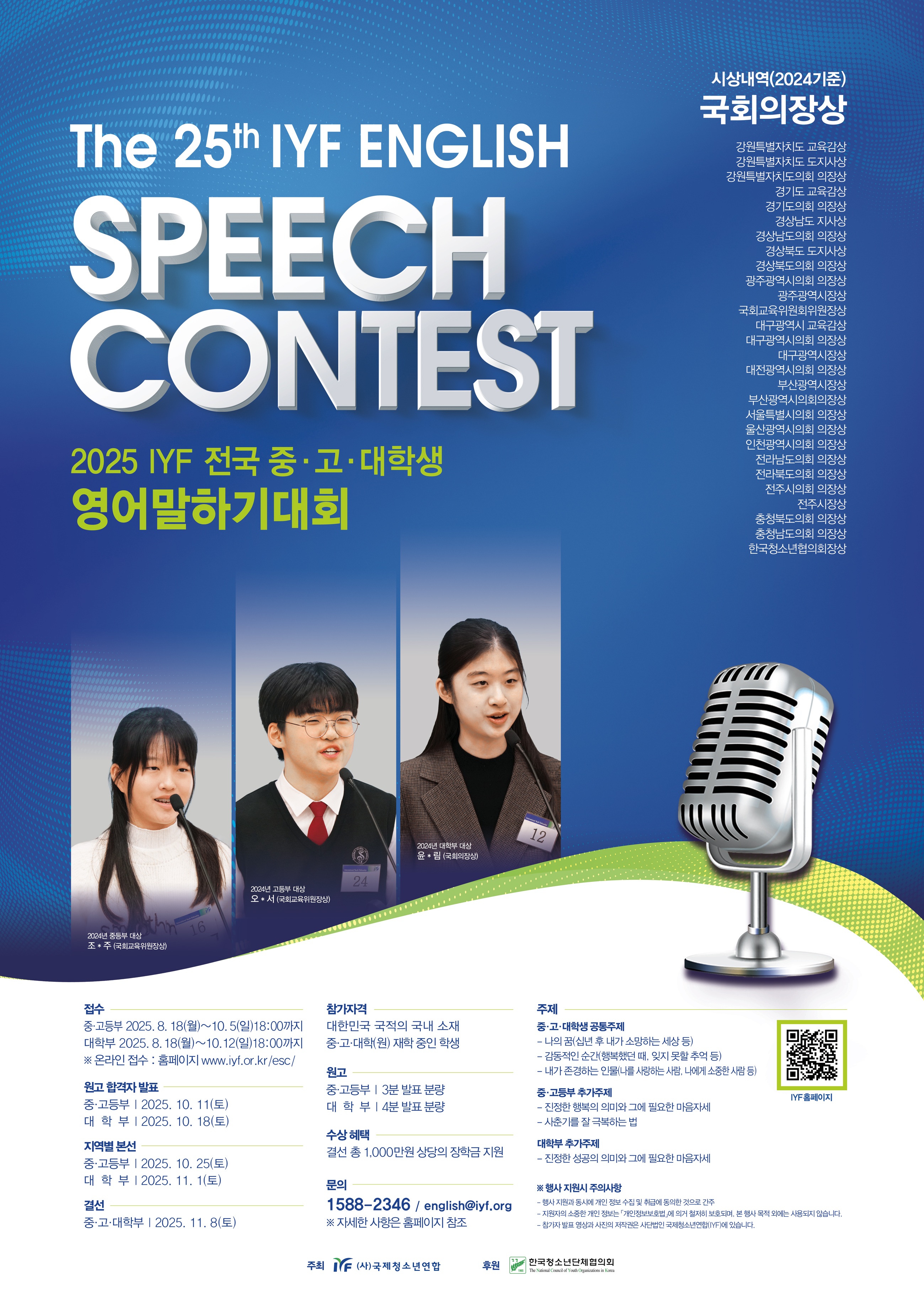 fnctId=bbs,fnctNo=1619 2025 IYF 영어말하기대회 홍보 알림 작성일 2025.09.18 작성자 학생복지과 직원 조회수 1687 첨부파일 2025 IYF 영어말하기대회 홍보요청의 건.pdf